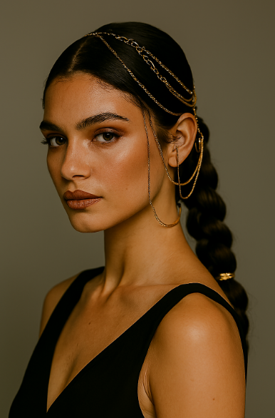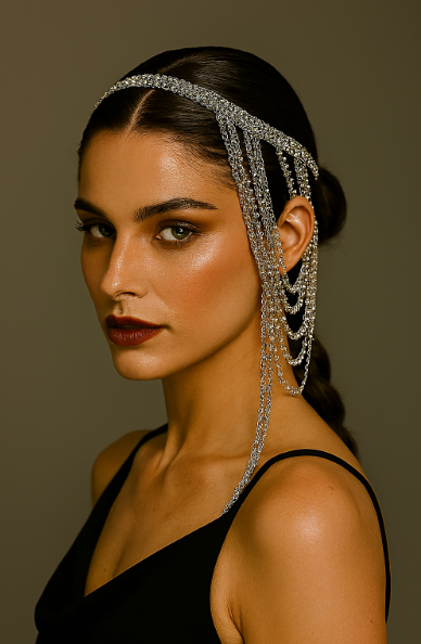 Hair chains—delicate or bold—are among the most theatrical yet wearable hair decorations. Suspended over braids, threaded through chignons, or draped across a crown, chains convert simple shapes into scene-setting compositions. They are particularly effective for festival-style or evening events where movement and sparkle are integral; in editorial contexts, chains articulate rhythm and motion across a close-up portrait.