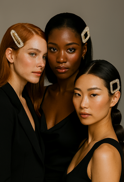 Statement clips and oversized barrettes are not mere holdfasts; they are visible accessories that anchor a look. Done in polished metals, oversized resin, sculptural acrylic or encrusted with pearls and rhinestones, these pieces act like brooches for the hair, and they scale easily from a daytime blazer to a red-carpet gown. Their visual logic is immediate: one well-placed clip transforms a side part or swept-back shape into a deliberately edited composition, concentrating attention at the temple or nape.